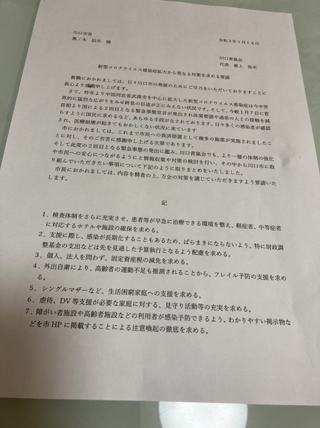 本日奥ノ木市長に新型コロナ感染症拡大に関わって2回目の緊急事態宣言が出された事から別紙要請を川口青嵐会として行い1時間に及ぶ面会をしてその旨を伝えて参りました。