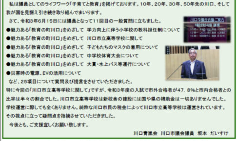 皆さんこんにちは。 本日9月議会が閉会しました。 予算議案、一般議案審議が済み川口青嵐会も賛成して終わりました。 特に皆様にお知らせしたいのは追加議案で中小企業事業者への川口市独自の支援金支給事業が可決されました。 …